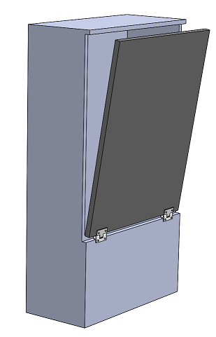 Vertikalt låg. Hængsler på toppen. I lukket position, hænger lågen nedad. Lågen åbner mod horisontal position.